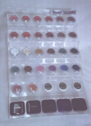 レチエ化粧品はメジャーなテレビ局で正式採用されています。もちろん、数多くのドラマや映画などにも採用されています。そういった「芸能界ネタ」もこのホームページでご紹介したいですね。 さて、97年4月に某テレビ局が移転しました。テレビでも新社屋を祝う特別番組が放映されて、メイクルームも映されたそうですから、ご覧になった方もいらっしゃるのではないでしょうか。 その新社屋のメイキャップルーム様子が上の写真です。(どちらの写真も汚くてすみません。)写真の中央にあるのが左の写真、レチエ化粧品のチークカラー、アイカラー、カバーベース、ピアニーパクトを載せたディスプレー台です。 |