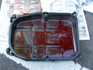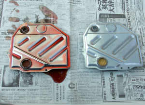 | 冒頭にも書いたようにDexron-3を使って、調子を落としてしまっているので、Dexiron-2に交換です。ついでですからオイルフィルターとオイルパンの掃除もしてしまいましょう。実はこのお掃除は念願の課題でした。Peugeot仲間の505のATFフィルターとオイルパンを見たとき、「これはウチの505と560も掃除しなければ!」と固く心に決めました。505のオイルパンを外してみると、案の定でした。560のオイルパンを外してみると、拍子抜けするほどきれいなものでした。 作業は簡単なものです。ATFオイルパンのドレンプラグを外して、ATFを抜きます。560は8リットル程度のATFが使われているようですが、ここで出てくるのは2リットル程度です。とりあえずドレンプラグを元に戻しておきます。 オイルパン左側にハーネスがタイラップで留められていますので、これを外します。それからオイルパンを止めている6本の13mmボルトを外しオイルパンを外します。 ミッション側の後ろのほうにフィルターが3本のビスで止まっていますので、ビスを外してフィルターを取り出します。 ウチの560は並行車で、パーツを注文するときに『もし間違えていても返品は受け付けない』と言われておりました。私のほうでパーツナンバーを調べるわけにもいかず、承諾するしかありません。で、フィルターを取り出してみるとパーツナンバーが違うし、若干形状も異なります。写真の左側は上からの写真で下側はもっと違ってます。う〜ん写真を撮り忘れた(^^ゞ でも、取り付けボルトの位置などは同じですので、いいかげんなカモちゃんはそのまま新しいフィルターを付けてしまいました。 さて、オイルパンの方ですが、これがスラッジも無ければ金属片のゴミもありません! どうなっているんでしょうか。ウチの505はスラッジが大量にあったし金属片もありました。505のフィルターは金属製のメッシュだけですけれど、560は紙のフィルターになっているからでしょうか。ちなみにフィルターの写真で大きいほうの穴に見える黄色いのがろ紙です。小さいほうの穴は金属メッシュが見えました。 オイルパンのパッキンはゴム製です。再利用可能なようです。とりあえずパッキンを調達しましたが、何分セコイ性格のカモちゃんですので、「漏れたら交換しよう」と再利用してしまいました。 オイルパンの取り付けボルトは対角線上に均等に・・・・とりあえず締めていきました。パッキンがゴムだし、シリンダーヘッドの締め付けみたいに神経を使わなくてもいいかなぁなんて思いながら、いいかげんな感じです。ただ、締め付けトルクは同じくらいにね。で、ミッション左側を通っているハーネスをタイラップで留める・・・と、いきたい所ですが、何分再利用のパッキンです。もしかしたらすぐにオイルパンを再び外さなければなりませんので、あとで留めることにしちゃいました。本当は寒かったのですが・・・・。 で、ATFを入れておしまいです。 しかし、560のフィルター交換は楽です。505の10倍は楽でした(^^)v |