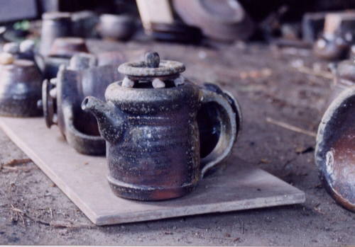 そうそうこうやって置いていれば・・・と思ったら後ろのポットが倒れている・・・・。 「焼き直すからいいんだ」と陶芸家は言っていたような・・・・。でもねぇ。先生、何とかしてくださいよぉ。これでは恥ずかしくてホームページに載せられないですよぉ。と言いながらしっかり載せてる(^^;