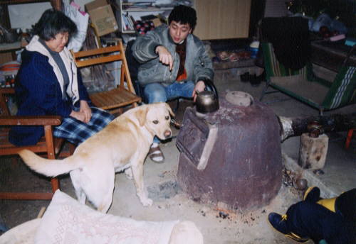 まるいのがこの家自慢のストーブ。割れて使えなくなった五右衛門風呂を改造したそうです。この上でお餅を焼いたり魚の干物を焼くとすごくおいしいです! そして威張っているこの犬。愛想はいいけれど「お座り」もできません。知らない人が来ても尻尾を振って番犬にもなりません。名前は「しょうた」といいます。でもメスです。この家で一番えらいそうです。