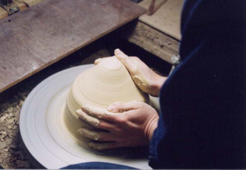 先程菊練りをした粘土をろくろの上に。くるくる回しながら心出し(この表現で良いのでしょうか)をしながら形を整えています。