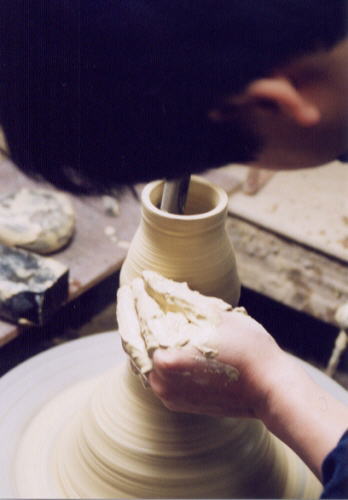 陶芸家は徳利がやぶれてしまわないように、注意しながら素早く中を膨らませていきます。きっとそうだと私は思いました。でも写真では分かりませんが、この時陶芸家はへらへら冗談を言っていました。雑念の多い陶芸家です。